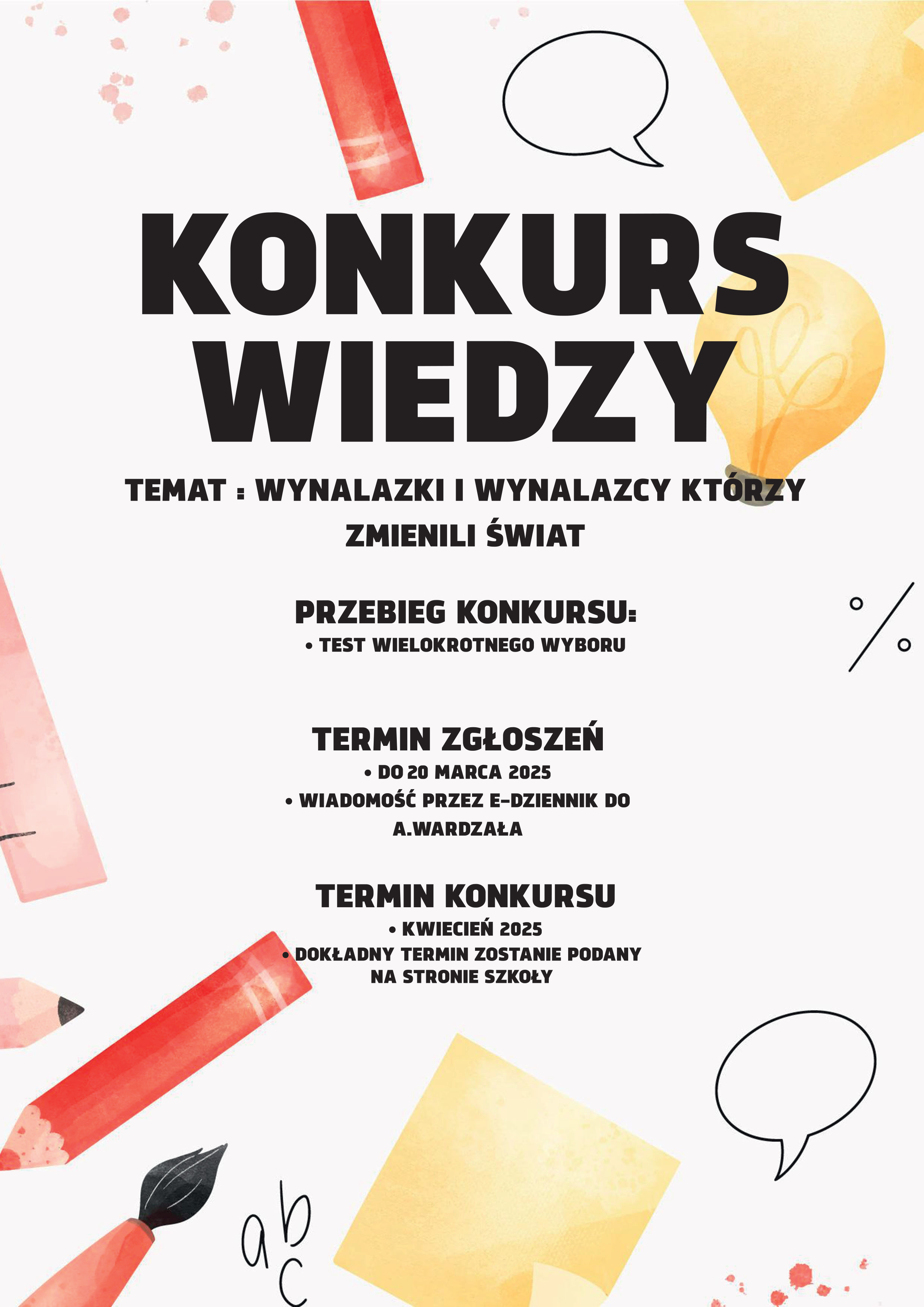 Zapraszam chętnych uczniów do udziału w szkolnym konkursie wiedzy na temat odkrywców i wynalazków, które znacząco wpłynęły na życie ludzi.