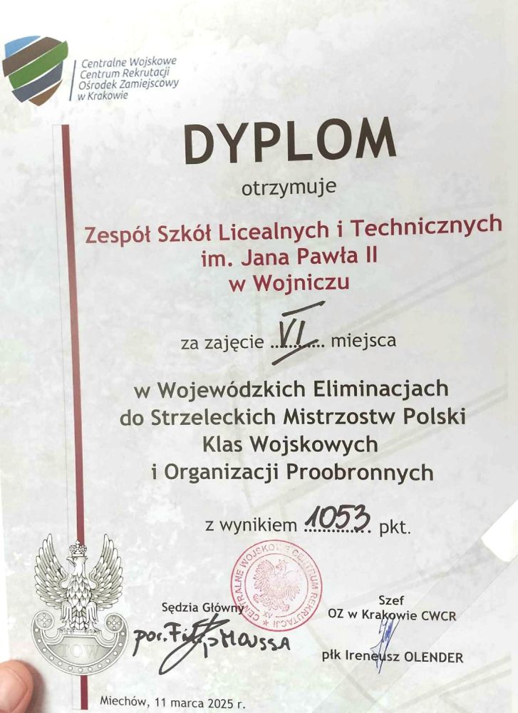 11 marca 2025 r. w Zespole Szkół Nr 2 im. Jana Pawła II w Miechowie, na wirtualnej strzelnicy odbyły się eliminacje wojewódzkie do Strzeleckich Mistrzostw Polski Klas Wojskowych i Organizacji Proobronnych.