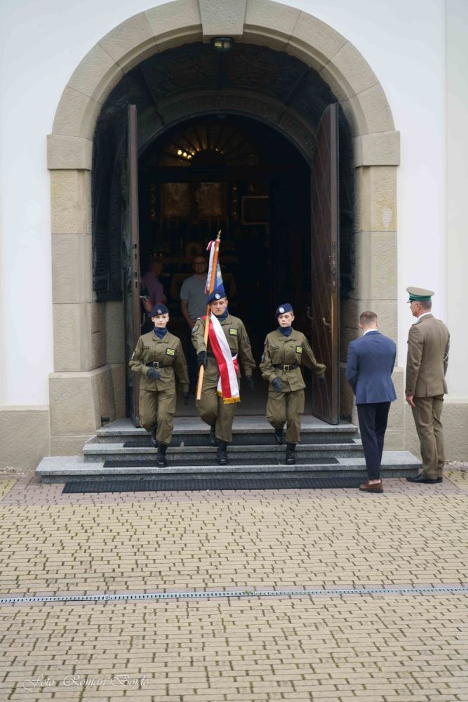 Po Mszy Świętej – przemarsz uczniów za pocztem sztandarowym na halę sportową.