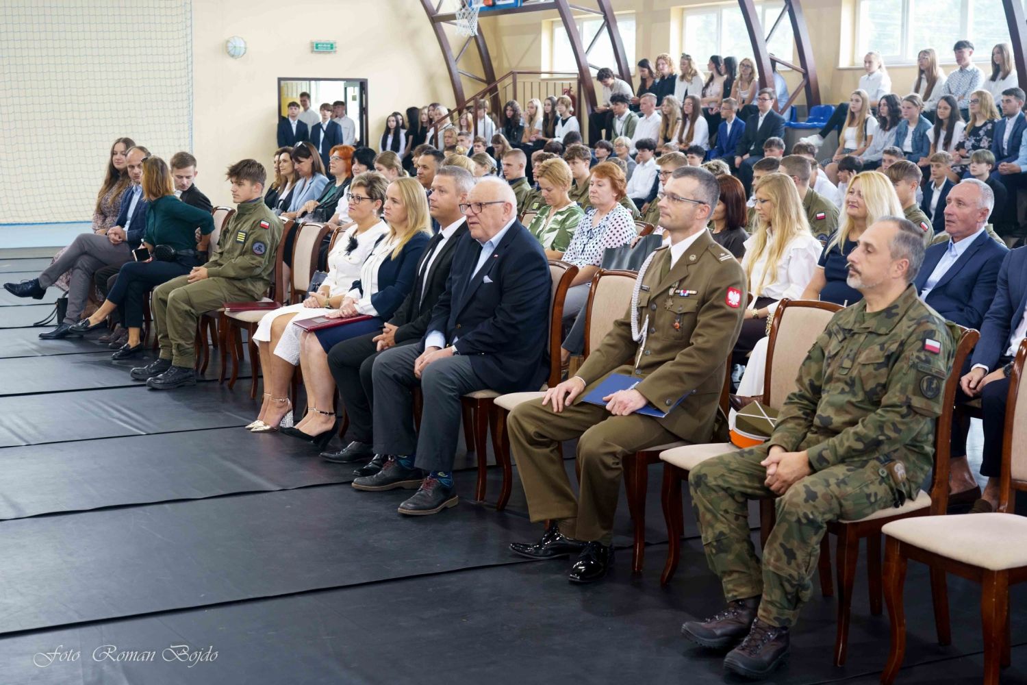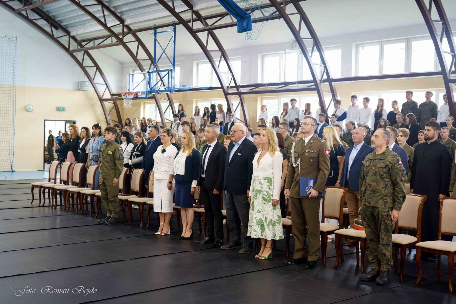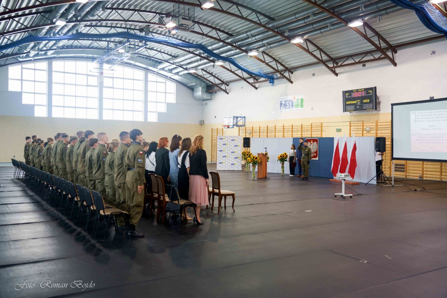 Uczniowie klas mundurowych przychodzą w mundurach, pozostali uczniowie w stroju galowym.