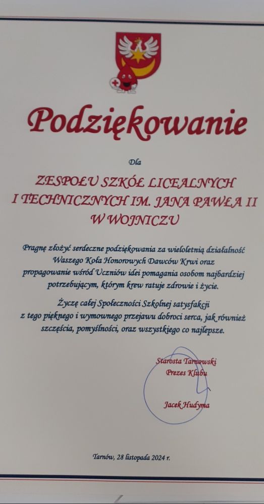 W dniu dzisiejszym przedstawiciele naszej szkoły, którzy są honorowymi dawcami krwi, brali udział w seminarium z okazji Dni Honorowego Krwiodawstwa oraz 15-lecia powstania Klubu Honorowych Dawców Krwi przy Starostwie Powiatowym w Tarnowie.