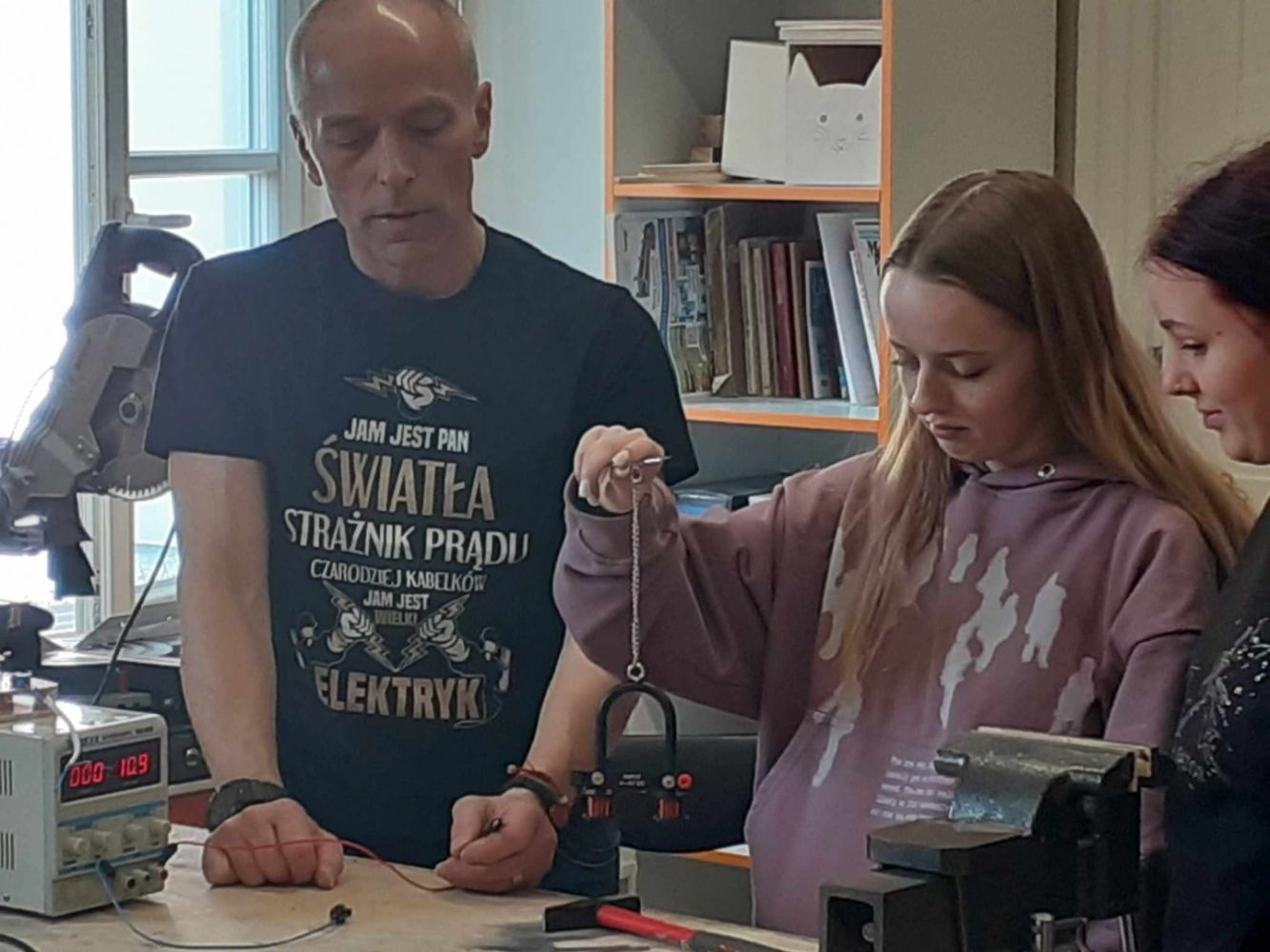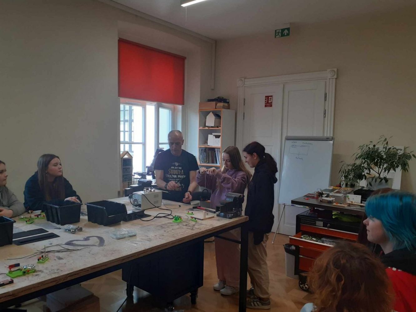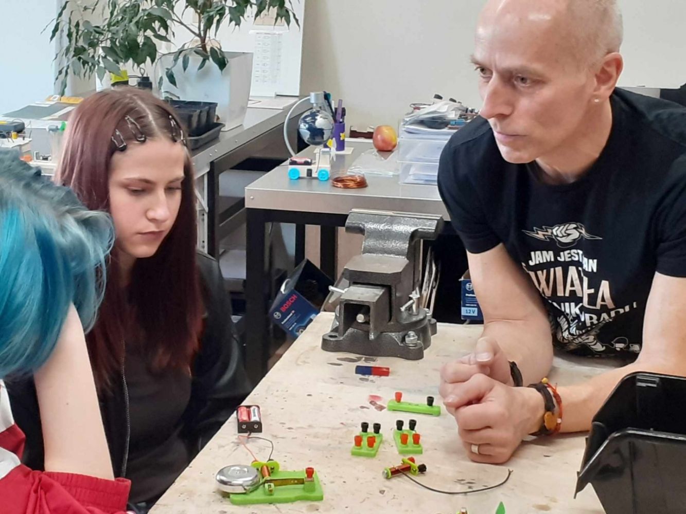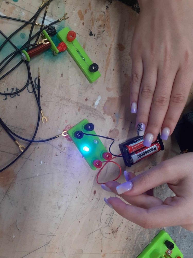 Młodzież miała także okazję sprawdzić swoją wiedzę i umiejętności z prądu elektrycznego. Uczniowie budowali obwody elektryczne, które uruchamiały wiatraki i dzwonki. Chociaż zadanie na pozór proste, wymagało kreatywności.